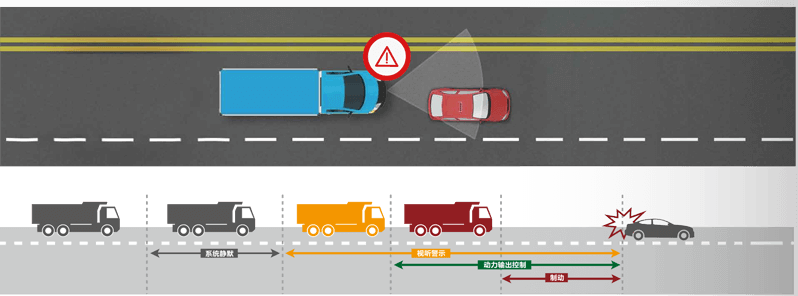 系统根据前方目标信息和自车状态实时计算人为避撞所需的制动距离和自车的最小制动距离,如判断出无法通过驾驶员操作 来避免的碰撞风险,则车辆通过切断动力输出(加速踏板不起作用),不再响应驾驶员加速需求,并自动施加全部制动力进 行紧急制动以避免或减缓碰撞。