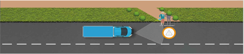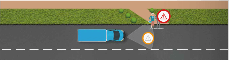 系统通过摄像头和雷达侦测自车行驶轨迹或同向车道内预行轨迹上的行人,当车辆可能与行人发生碰撞时提前发出警告。适用于多种状态的行人。