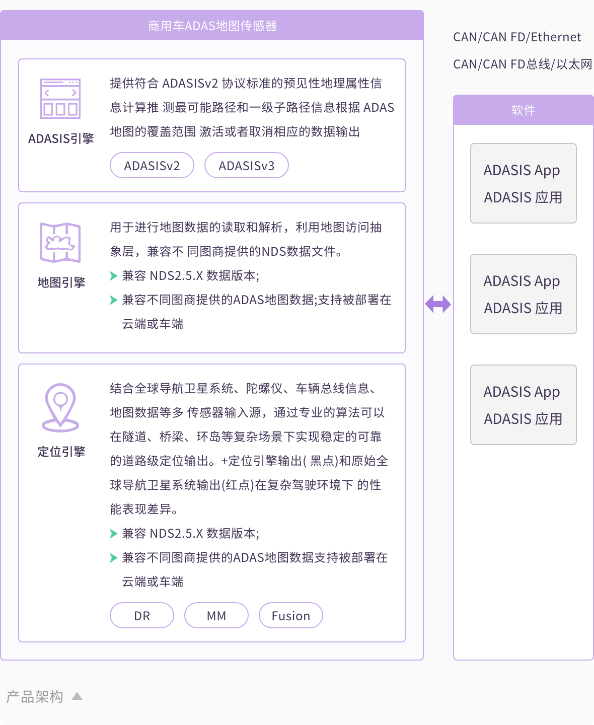 本产品为智能网联汽车感知层所研发的车规级高可 靠的地图传感器,能提供预见性地理信息,以提高智 能网联汽车的环境感知和数据融合的能力。